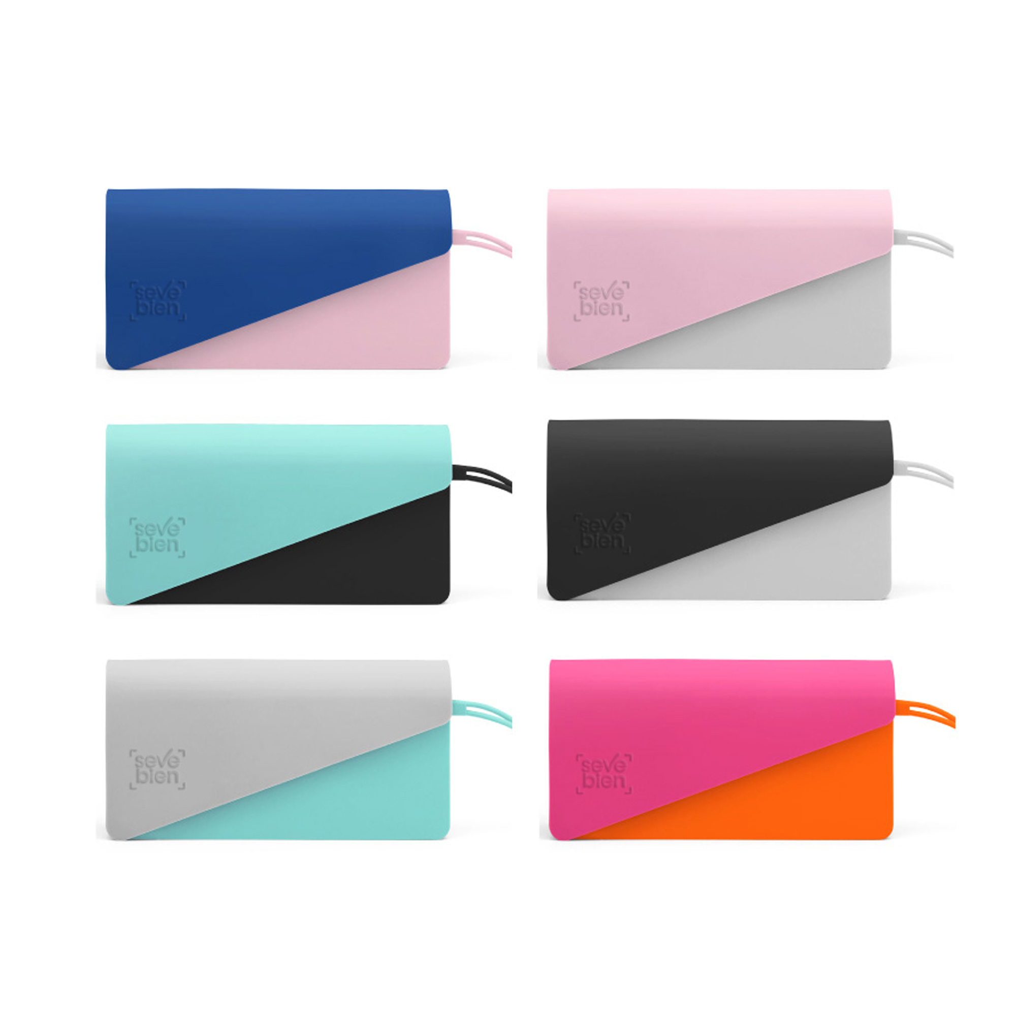 23,5 x 12 x 6,4 cm. Silicona. Sobre de silicona con solapa imantada y correa desmontable. Su interior tiene 3 compartimentos para guardar de todo. Presentación en caja de regalo.